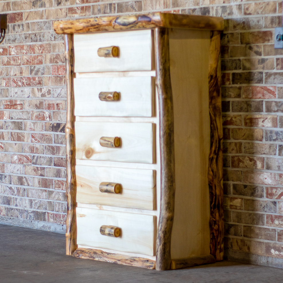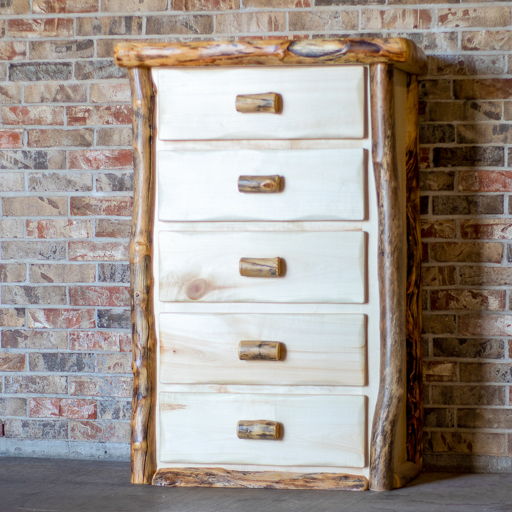 The Light Aspen 5 Drawer Chest with Aspen Flat Panel drawer fronts is fully hand crafted from start to finish. Using the artistic natural color of the aspen logs which brings unique look and style. The Aspen Log is found in the Mountains of Colorado. Aspen Log Furniture is always going to be unique in character, look and feel, with artistic splits, checks, cracks and gnarly elk chew. The Aspen Log Collection will never have two products that are the same.